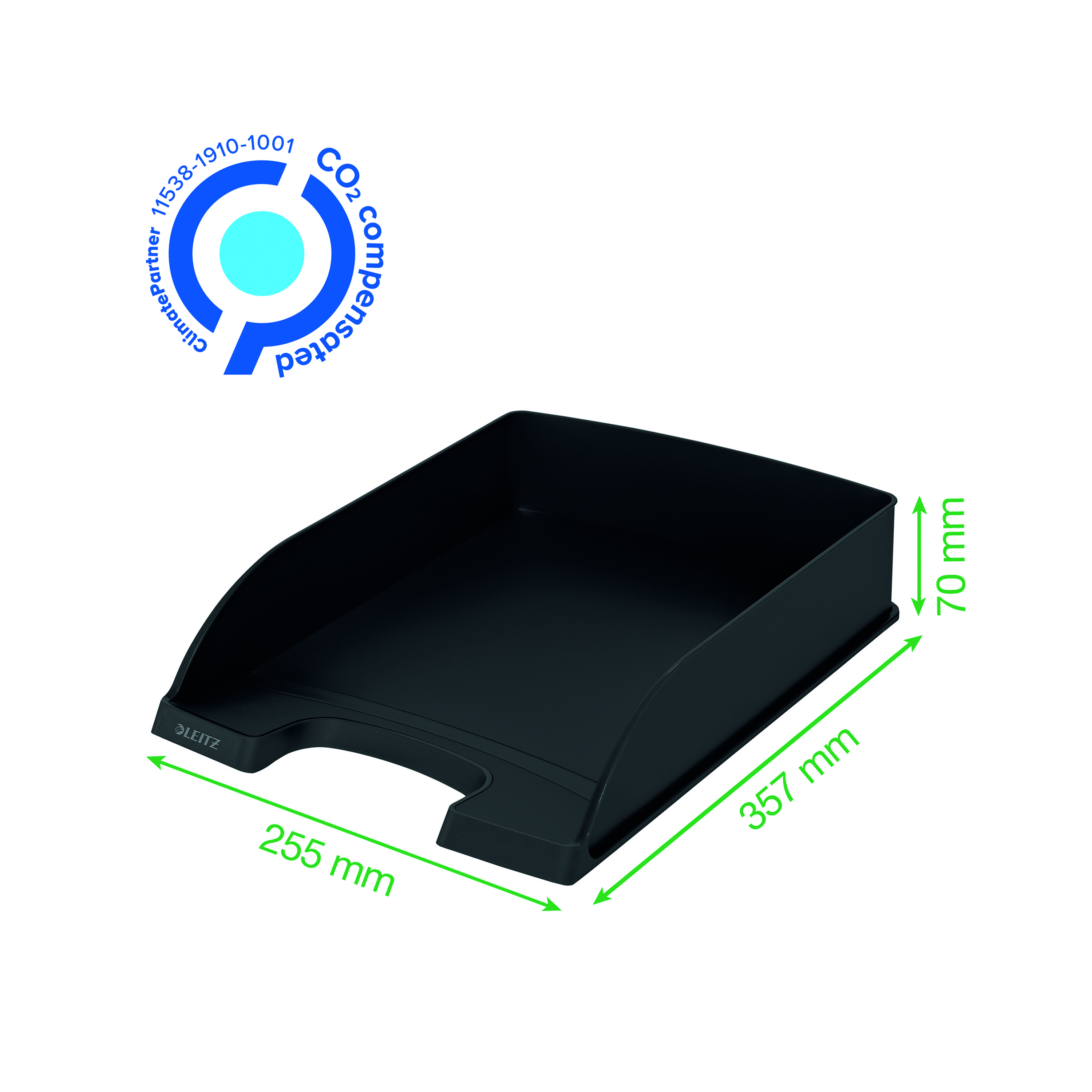 Eye-catching, premium quality Letter Tray made min. 90% post consumer recycled plastic suitable for A4. 100% recyclable and with Blue Angel environmental certification. This robust paper tray perfectly complements other products from the Leitz Recycle range and is made to last. Modern and contemporary green stationery that will look great at home and in the office. With the eco friendly Recycle range from Leitz you can both improve your office environment – and the environment of our planet.